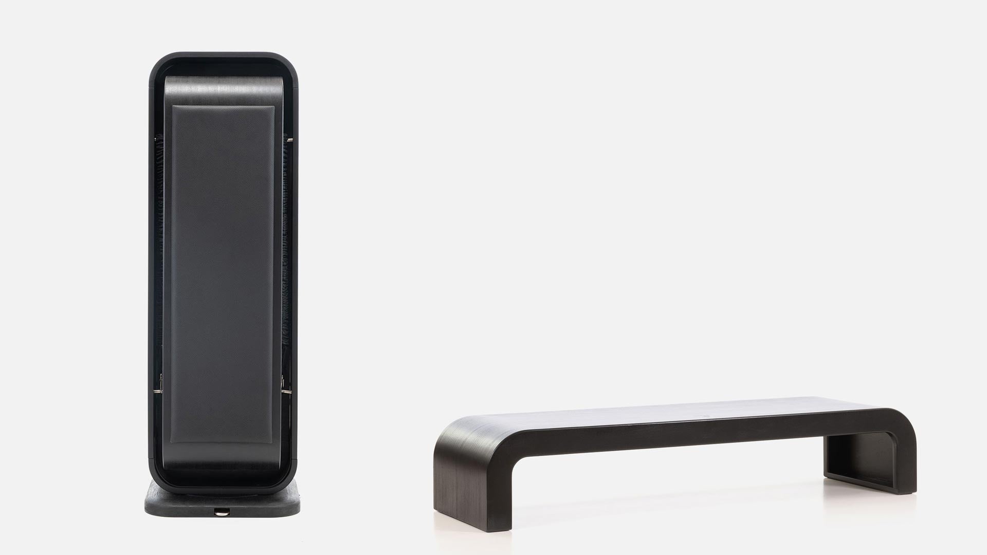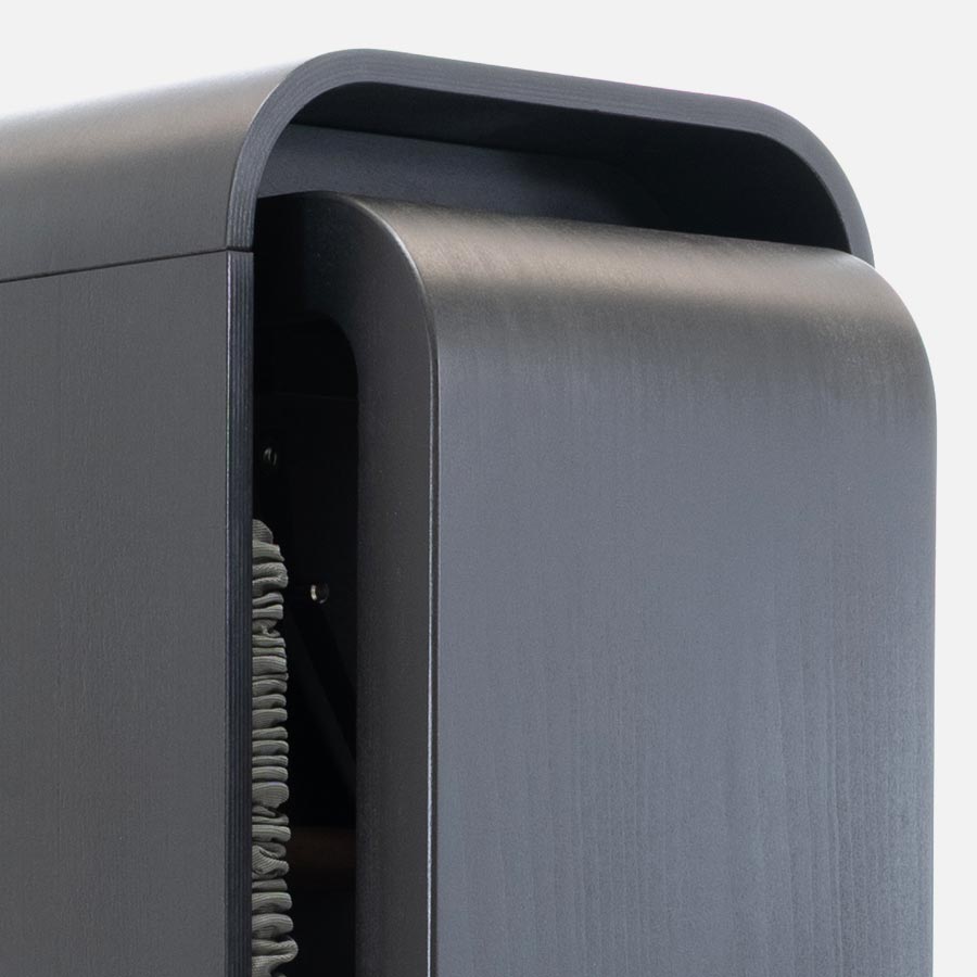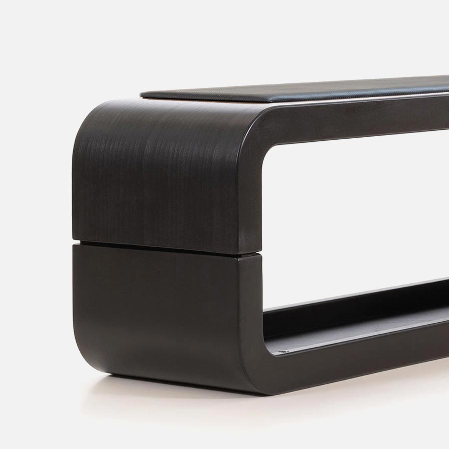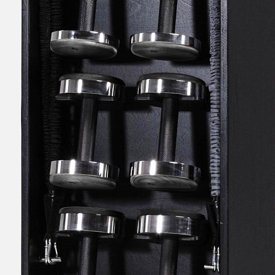 A lekerekített oldalfalak kiváló minőségű, furnérozott rétegelt lemezből készülnek, fekete pácolt bükk tömörfa kerettel. Nemcsak karakteres design-elemek, hanem funkcionális step padok és edzőpadok is egyben. Mögöttük a teljes edzésfelszerelés okosan elrejtve kap helyet – a rendezett, letisztult fitneszkörnyezetért.